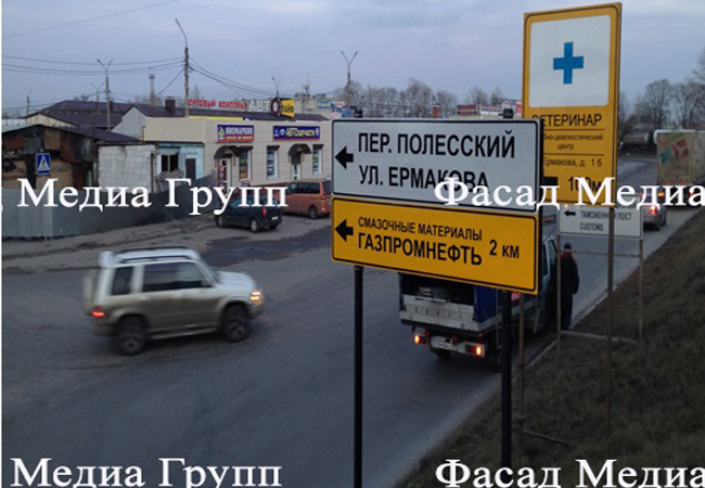 В условиях городской среды размещение информации о компании на дорожных указателях является эффективным средством продвижения бренда организации, поддержания внимания к вашему бизнесу, привлечения новых клиентов и удержания старых покупателей и заказчиков. Именно дорожные указатели, установленные на улицах города, помогают горожанам найти вас и купить необходимые товары или заказать услуги. Для размещения рекламы на дорожных знаках обращайтесь в рекламное агентство «Фасад Медиа Групп». Будем рады сотрудничеству.